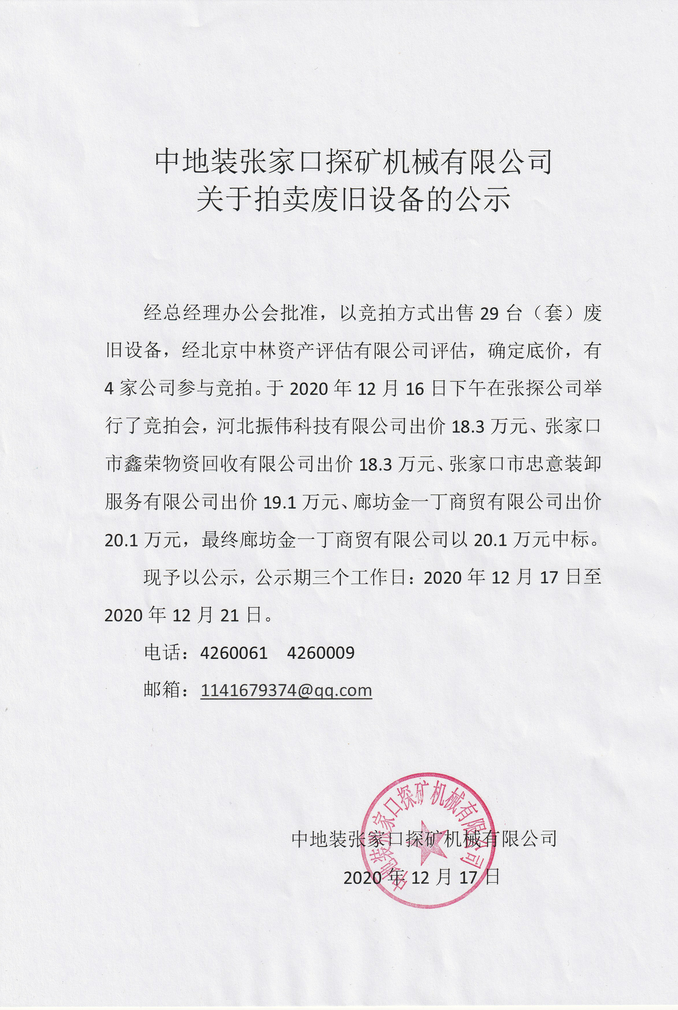 中地裝張家口探礦機械有限公司關于拍賣廢舊設備的公示